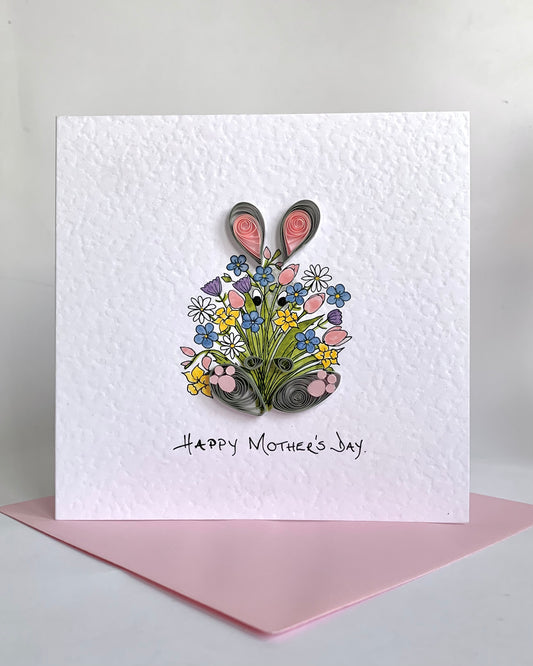 Hand Painted Mother’s Day Card - Peek-a-Boo!- Quilled Bunny with Spring Flower Bouquet