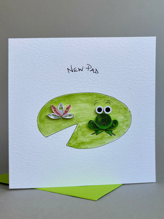 Handmade 3D New Home Card - New Pad - Quilled Frog & Flower on Hand Painted Lily Pad