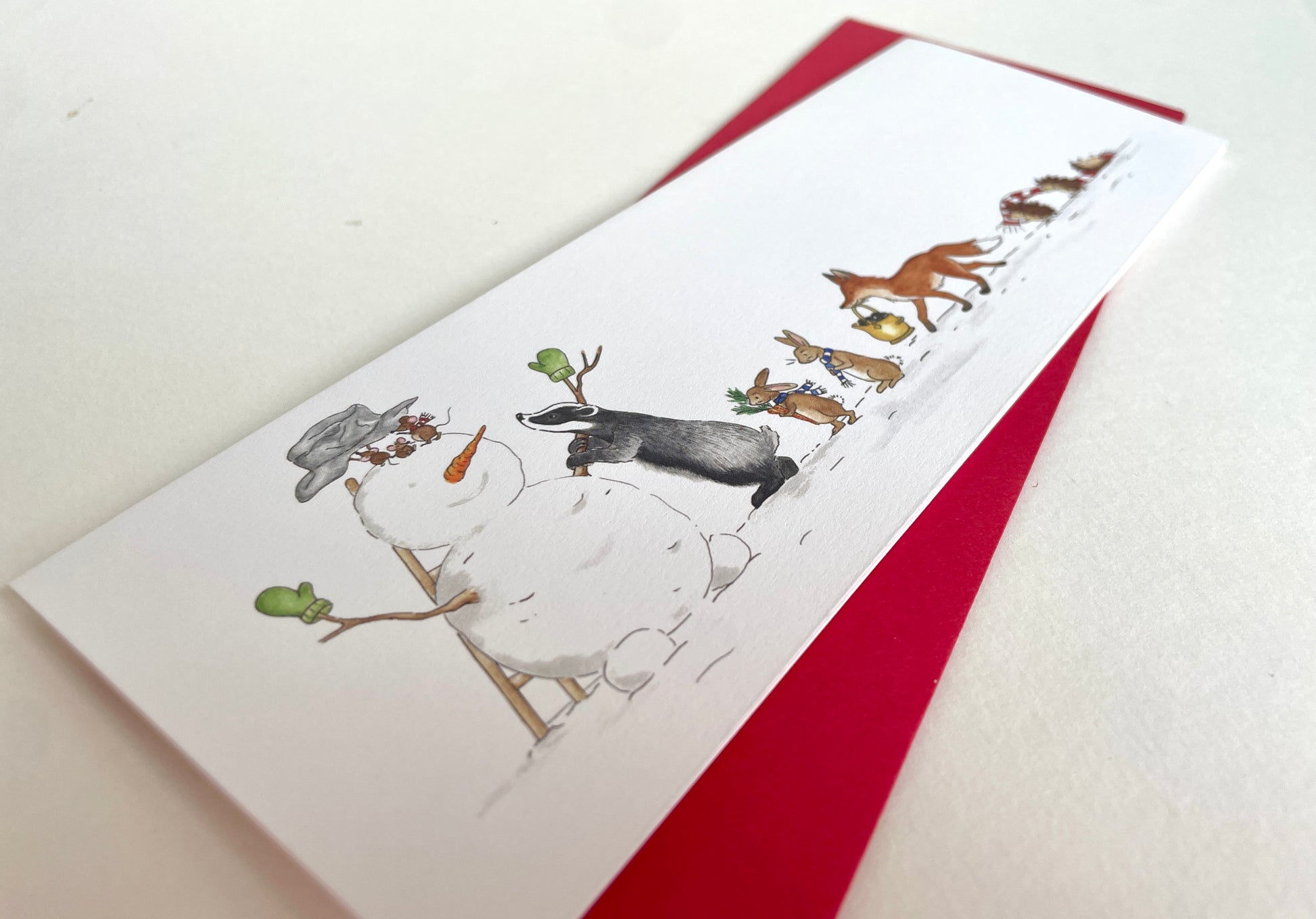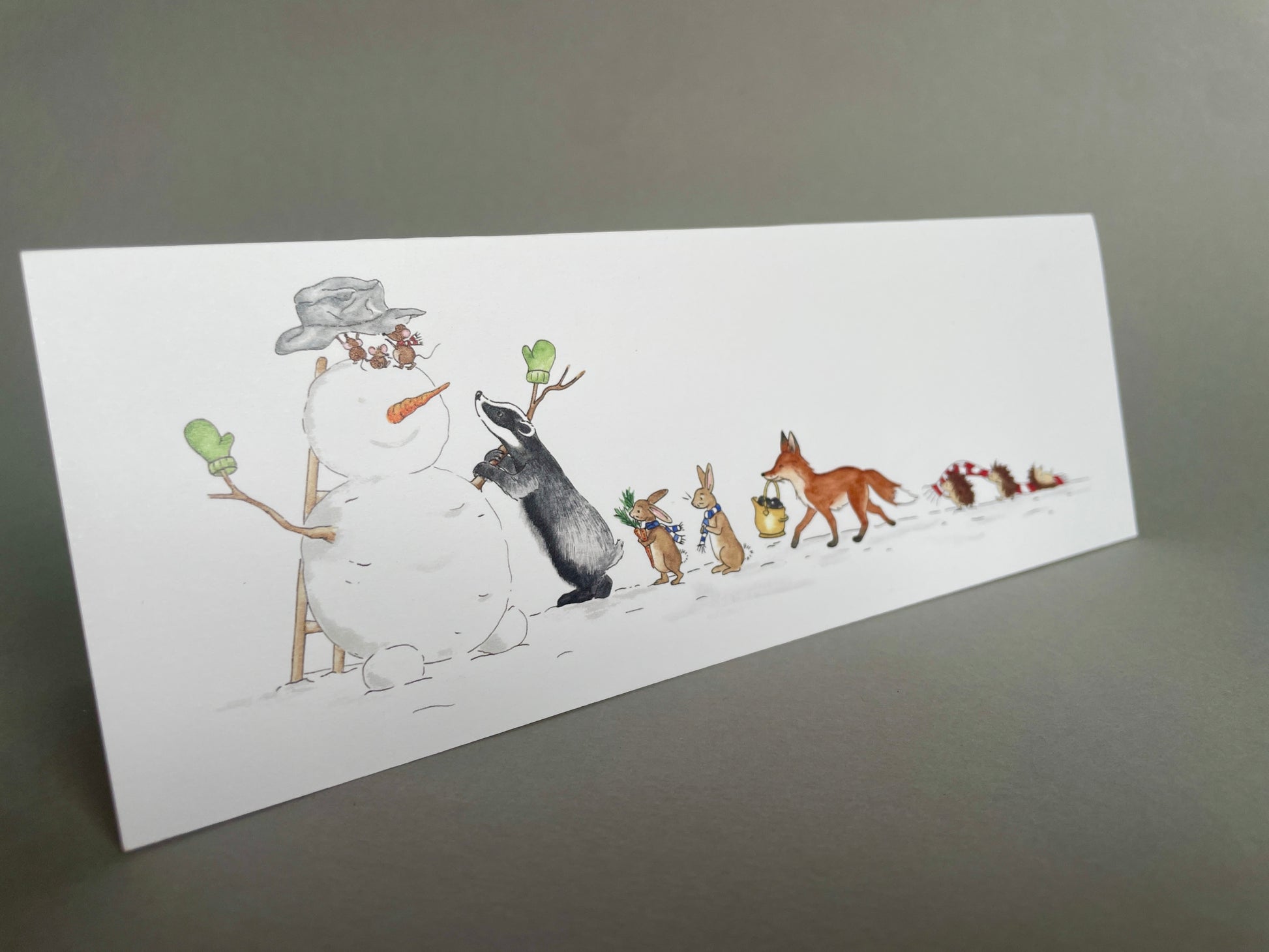 This popular traditional Christmas card features a collection of woodland animals all working together to bring all-important bits and bobs - hat, coal, carrots, and a scarf - to build a snowman.