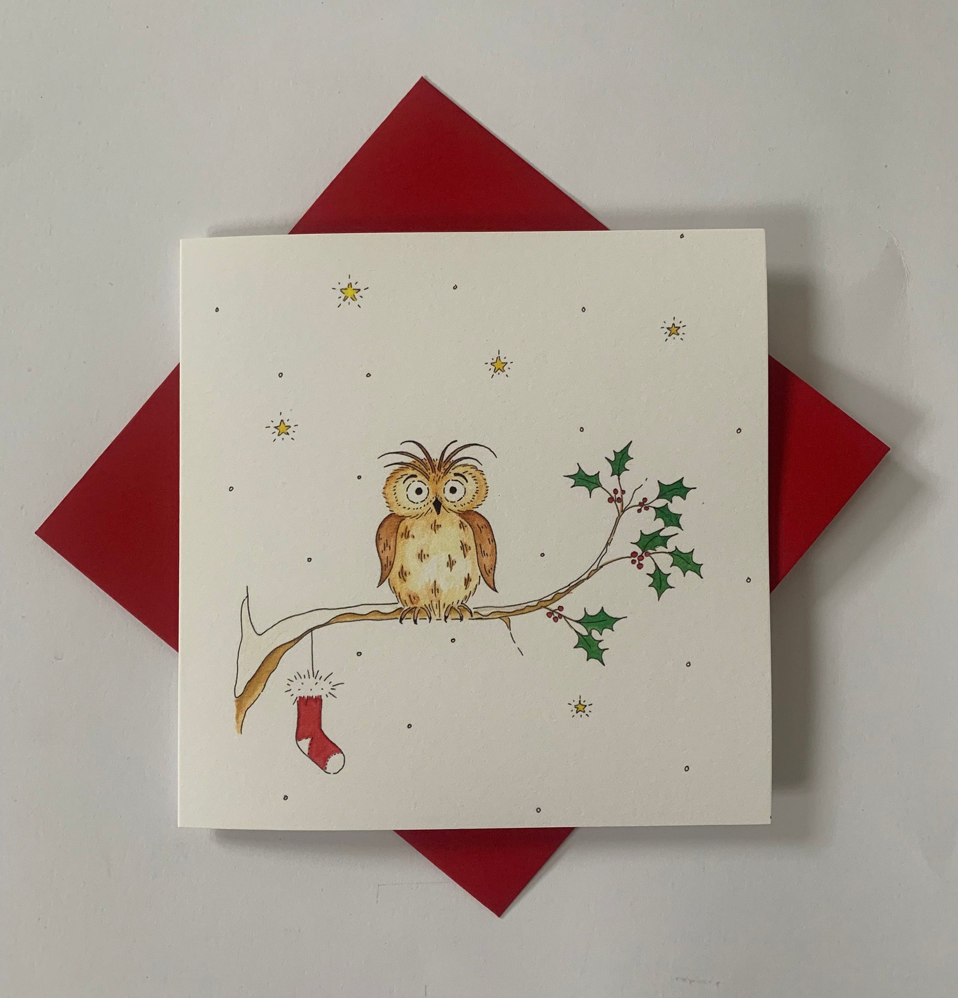 A traditional Christmas card featuring a very special owl on a snowy Christmas night, hanging its stocking from a branch.