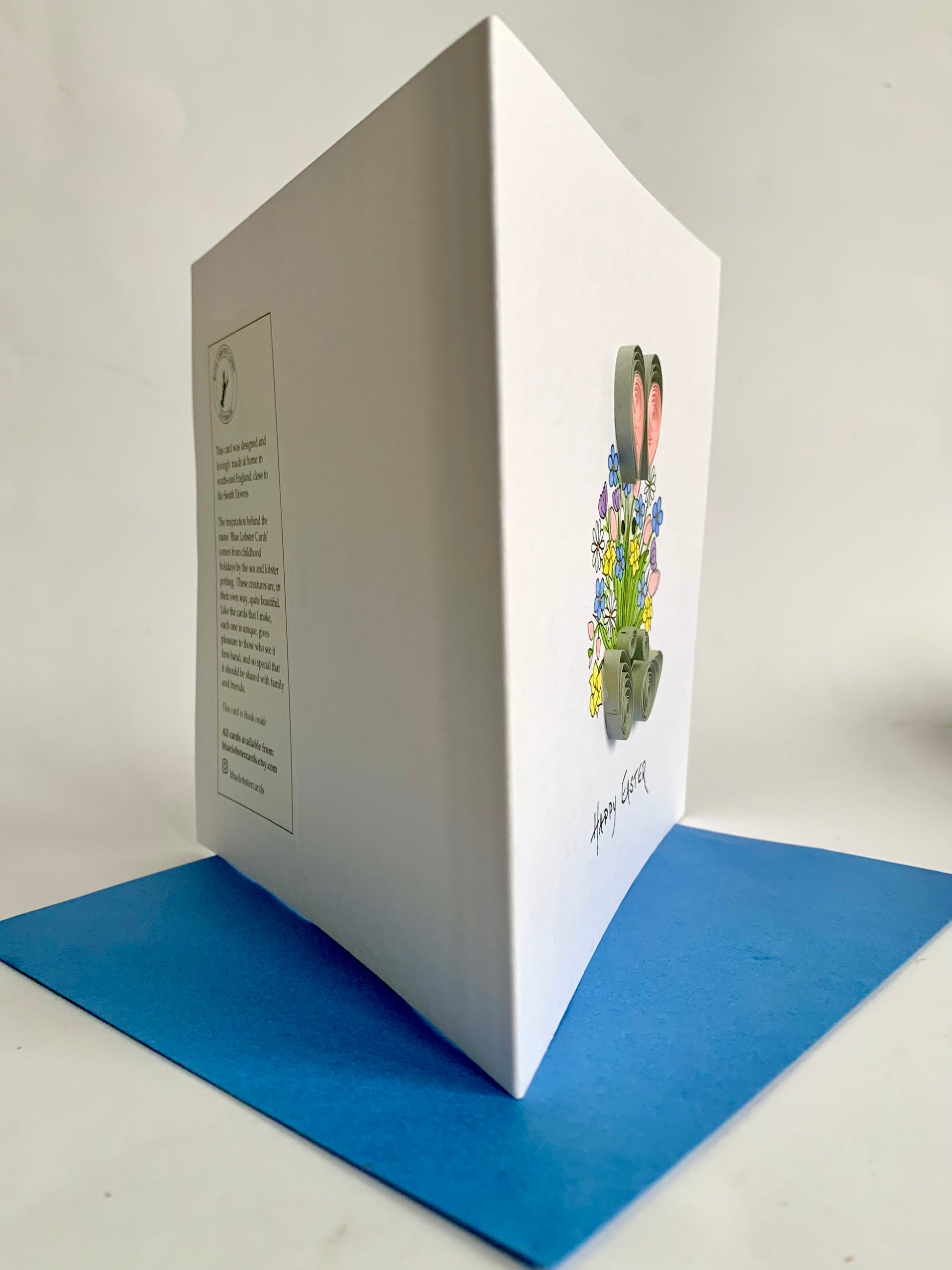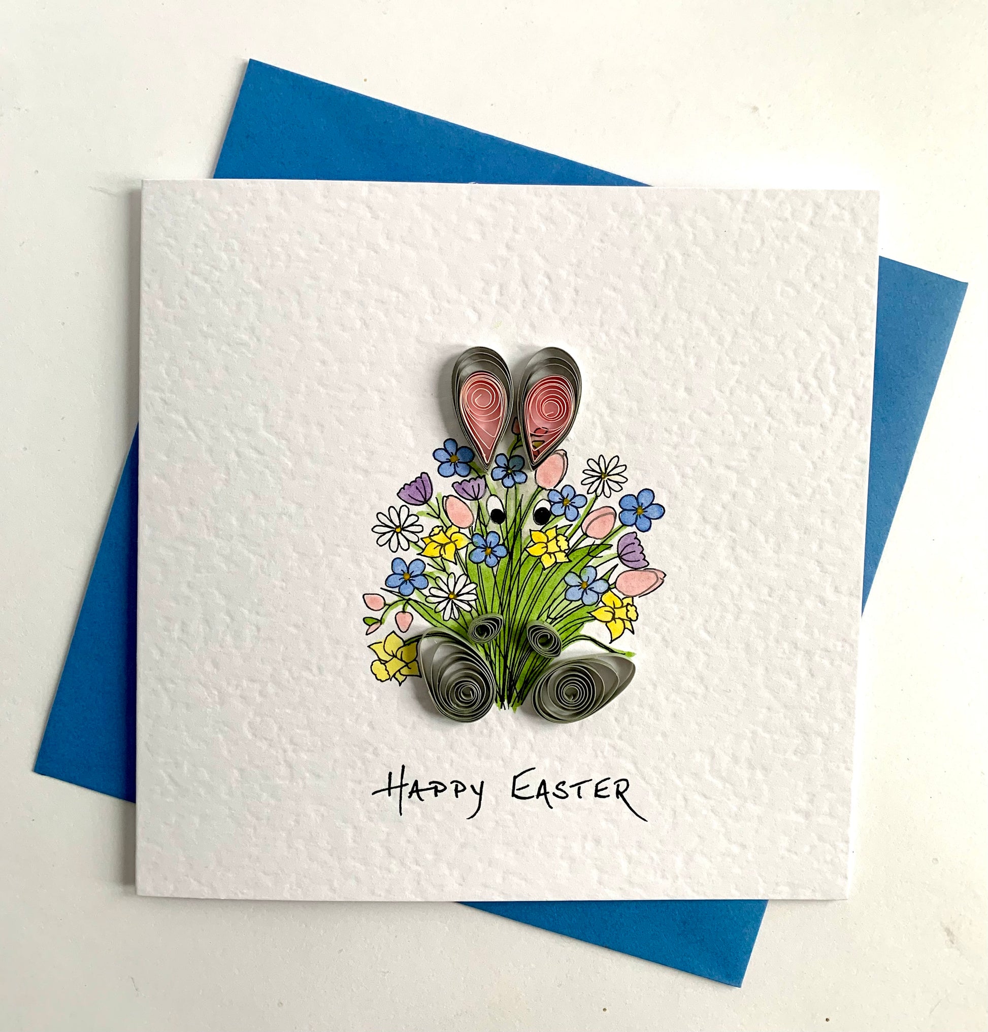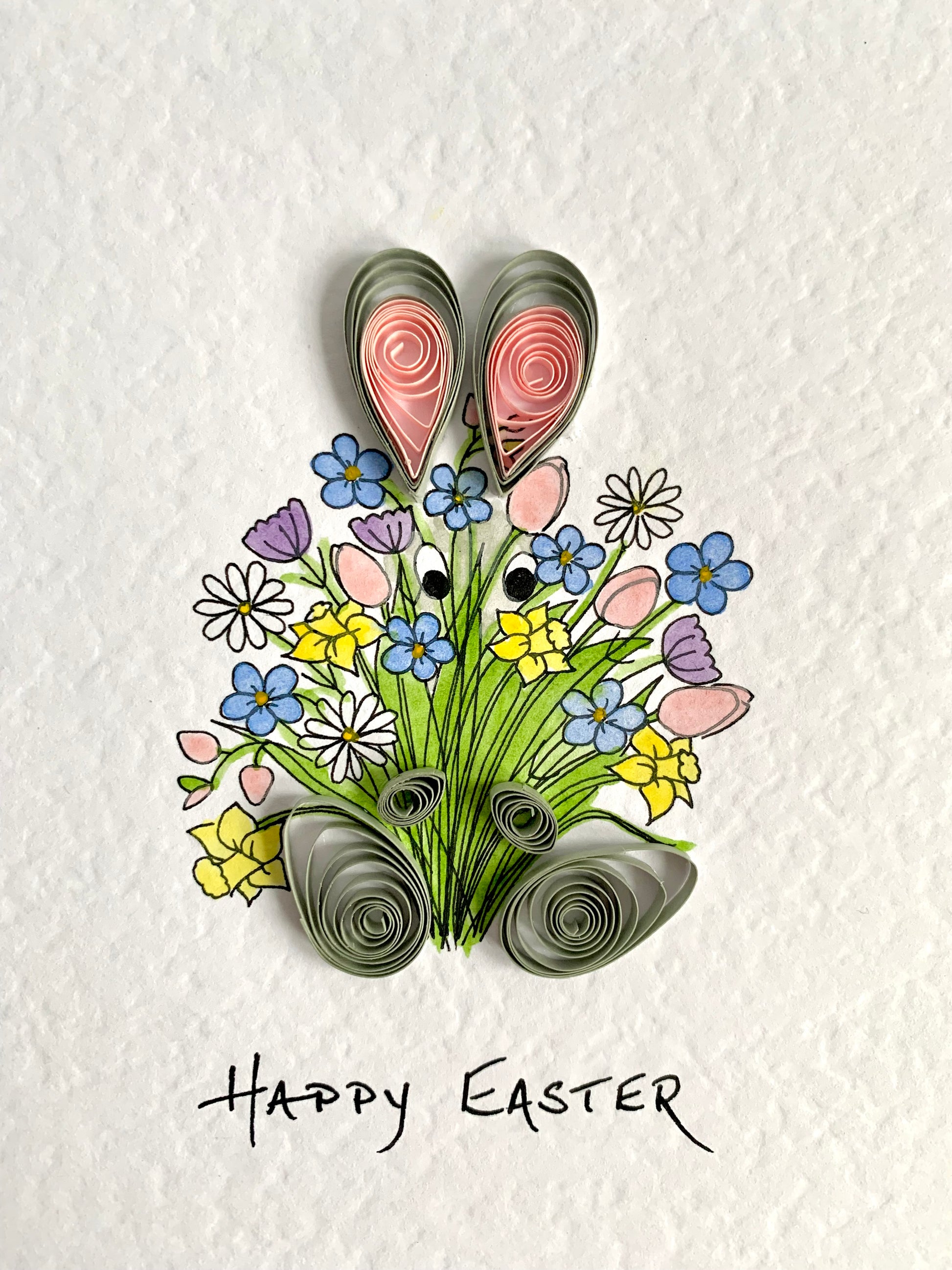 A unique, hand painted Easter card featuring a huge bunch of spring flowers, with two eyes peeking through, large quilled bunny ears above, paws and quilled bunny feet below
