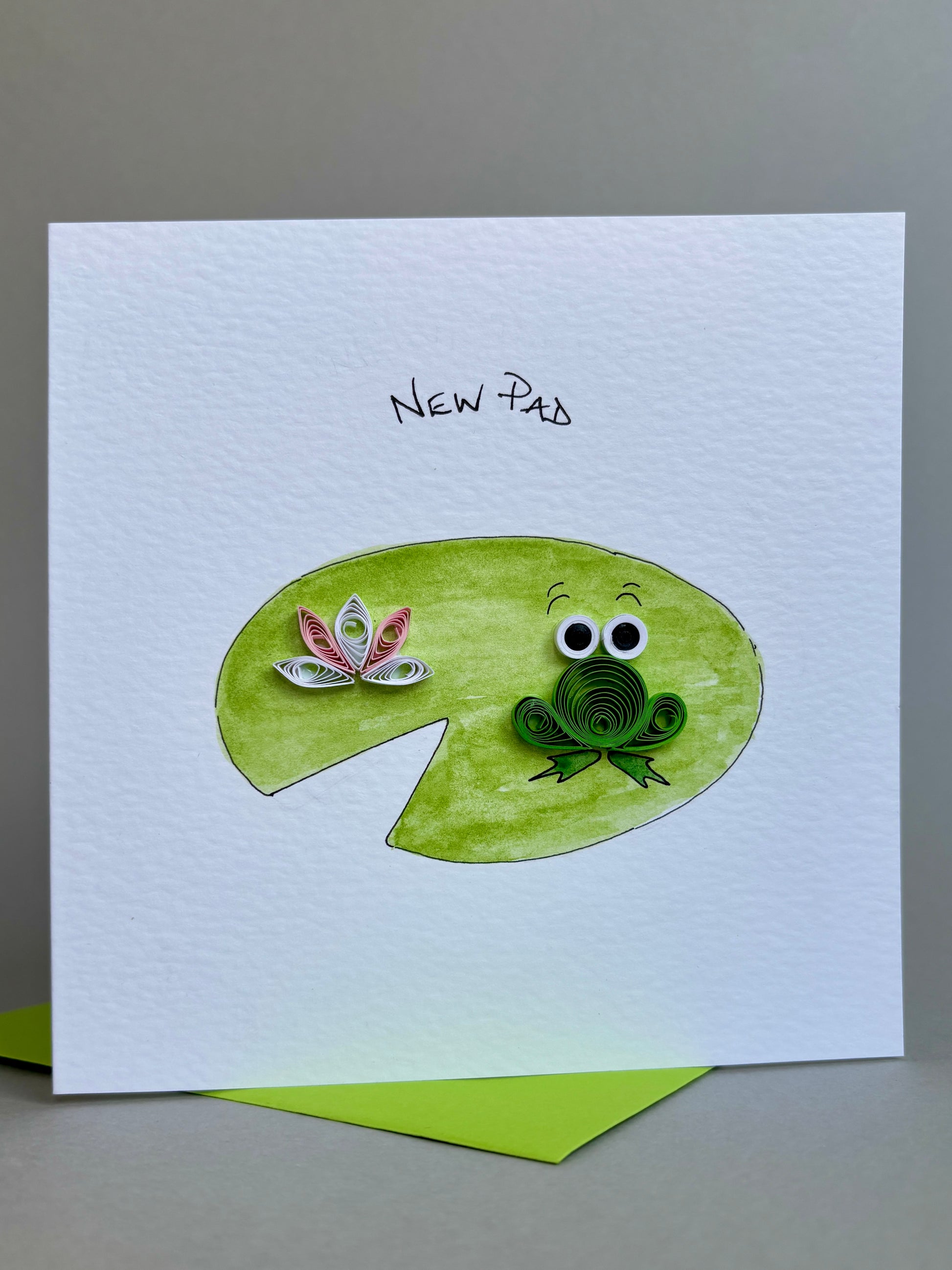 Cute handmade ‘New Home’ card featuring a quilled frog sitting on a hand painted lily pad and beside a quilled water lily flower ’New Pad’ is handwritten above