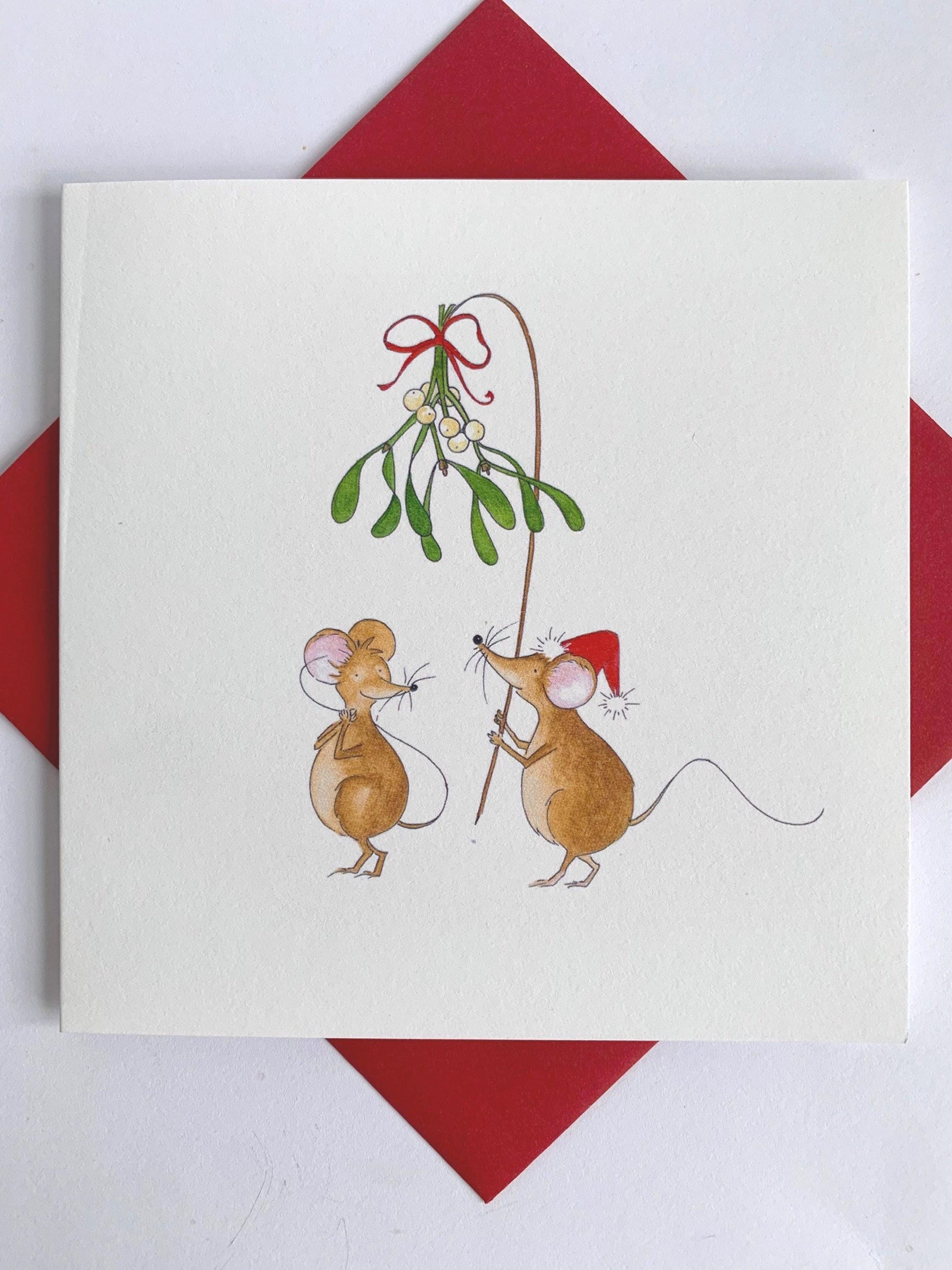 Featuring two Christmas mice with a large sprig of mistletoe tied up with Christmas ribbon held up over the two of them….