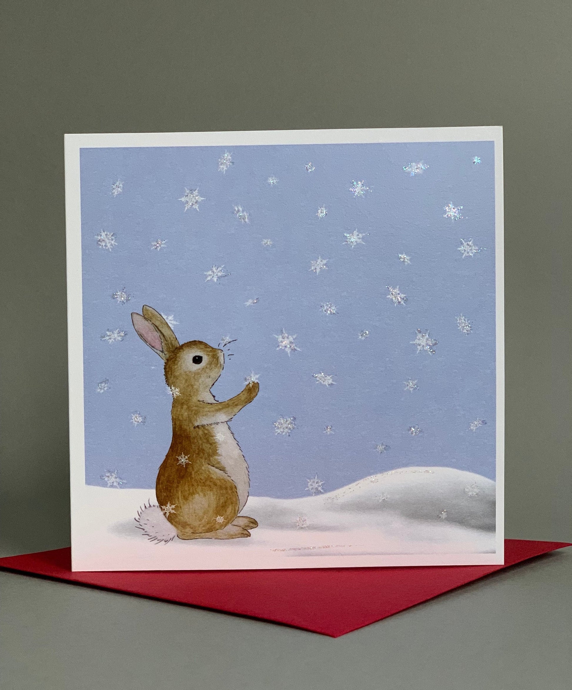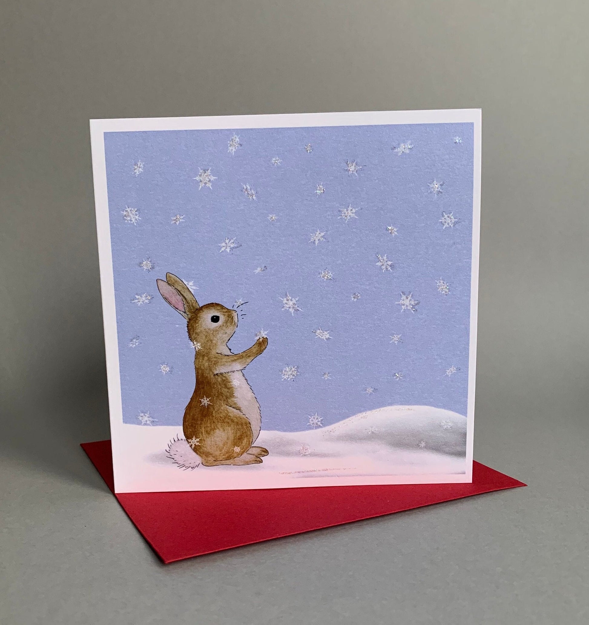 A unique yet traditional Christmas card from an original watercolour design that features a bunny in the snow, catching snowflakes.