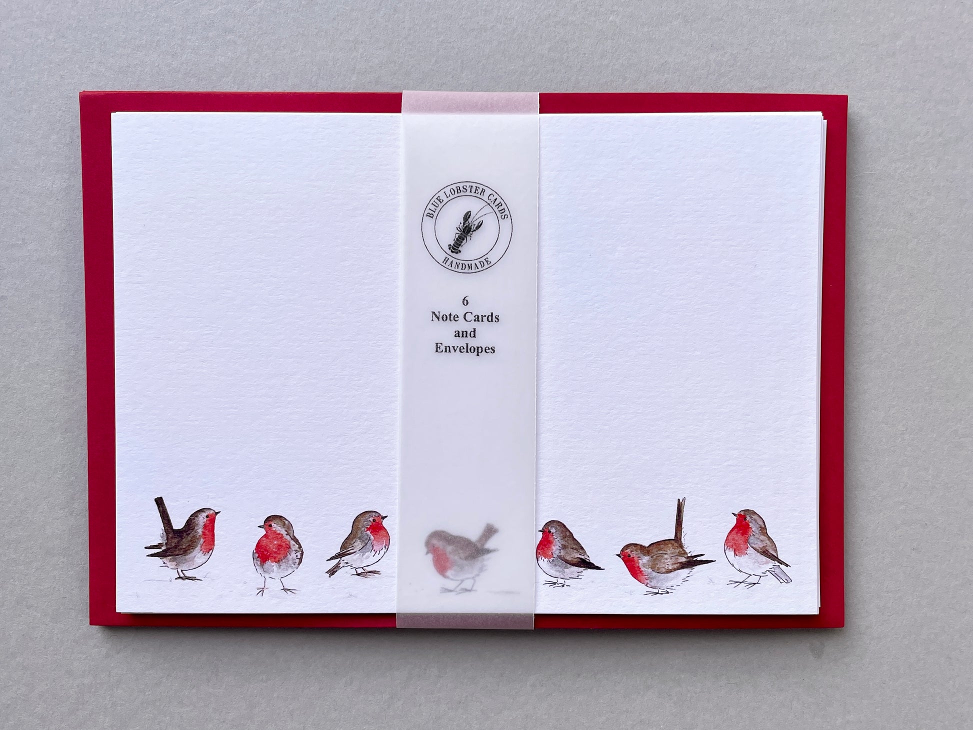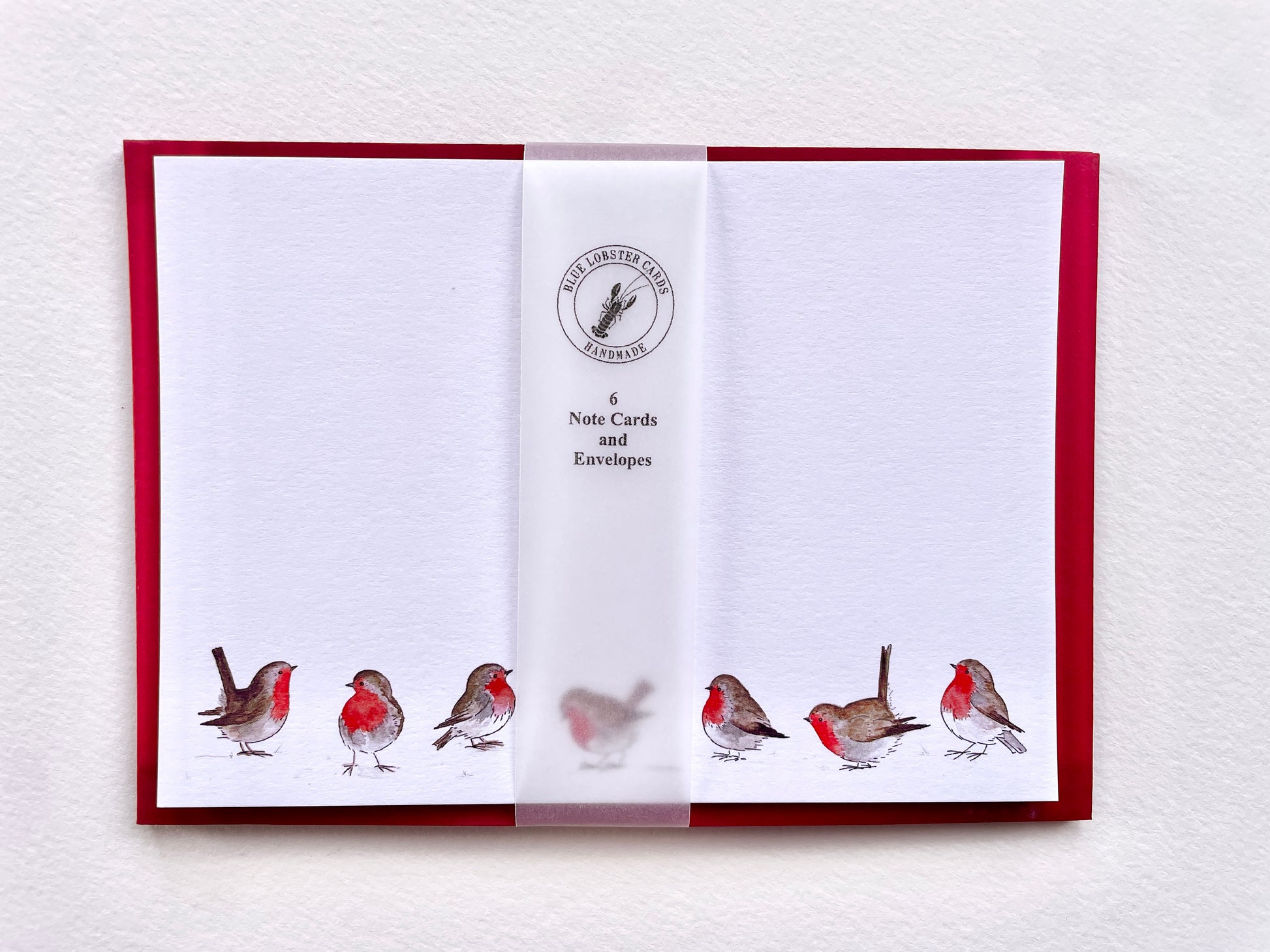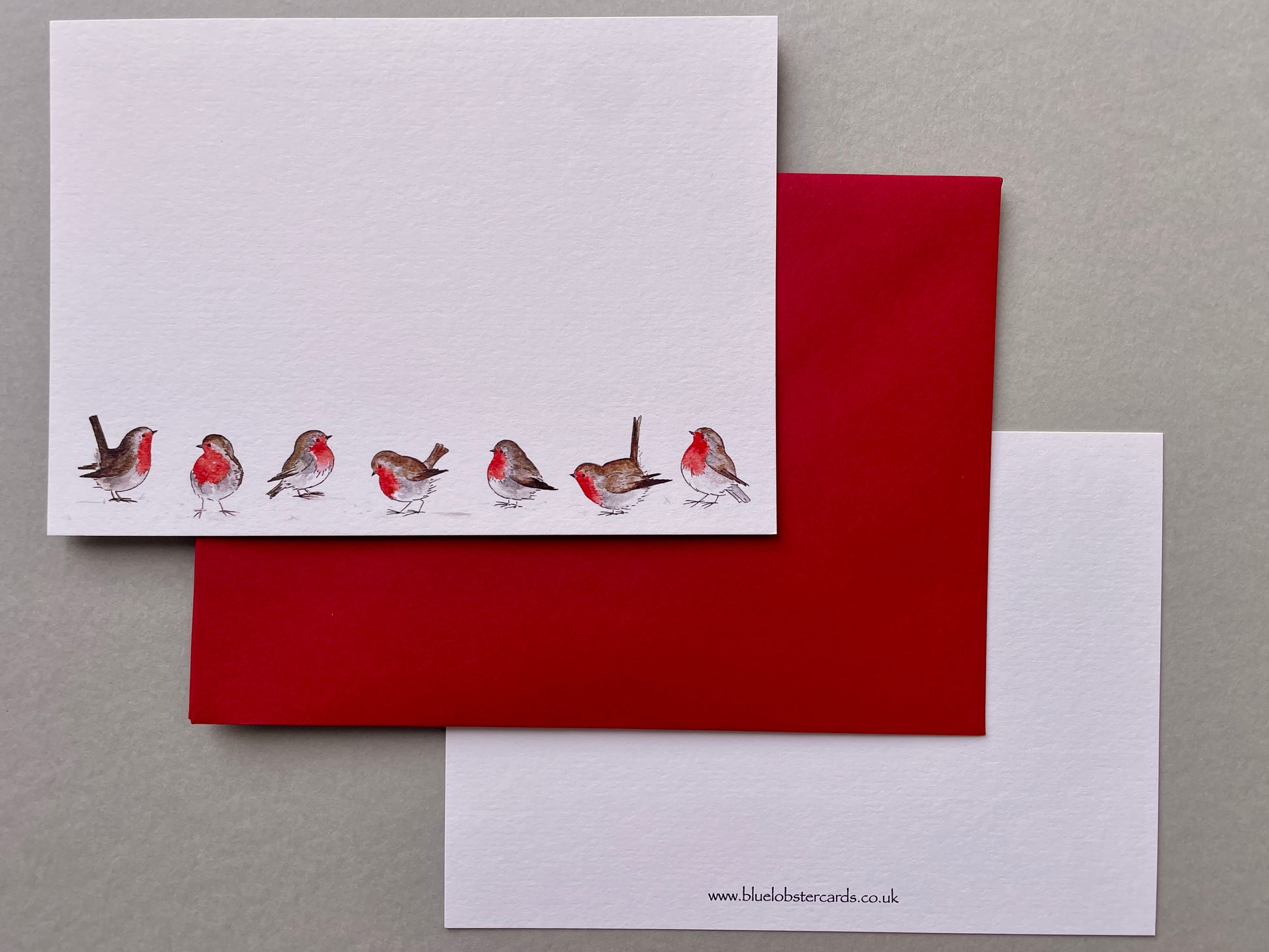 A cheerful winter stationery set featuring a group of robins in the snow. Each set comes with vibrant red envelopes – perfect for gifting or keeping for yourself.