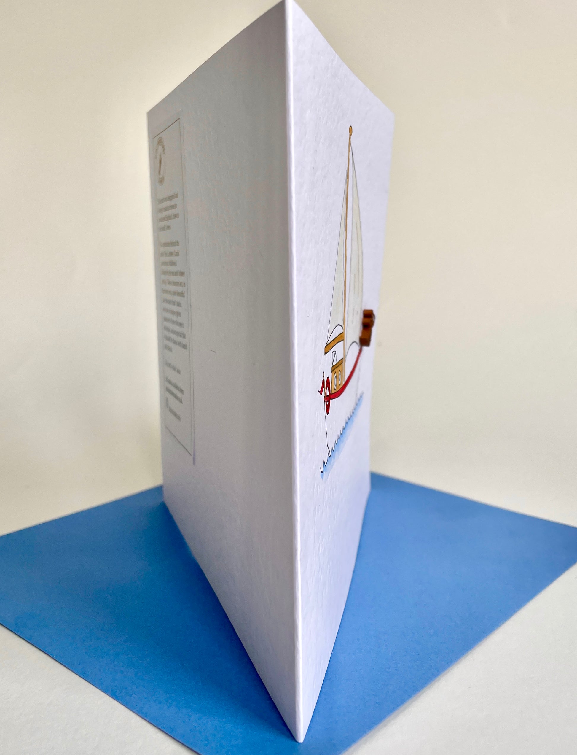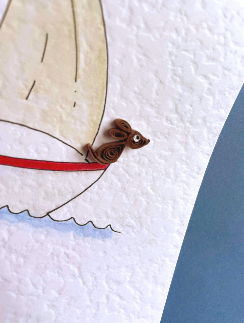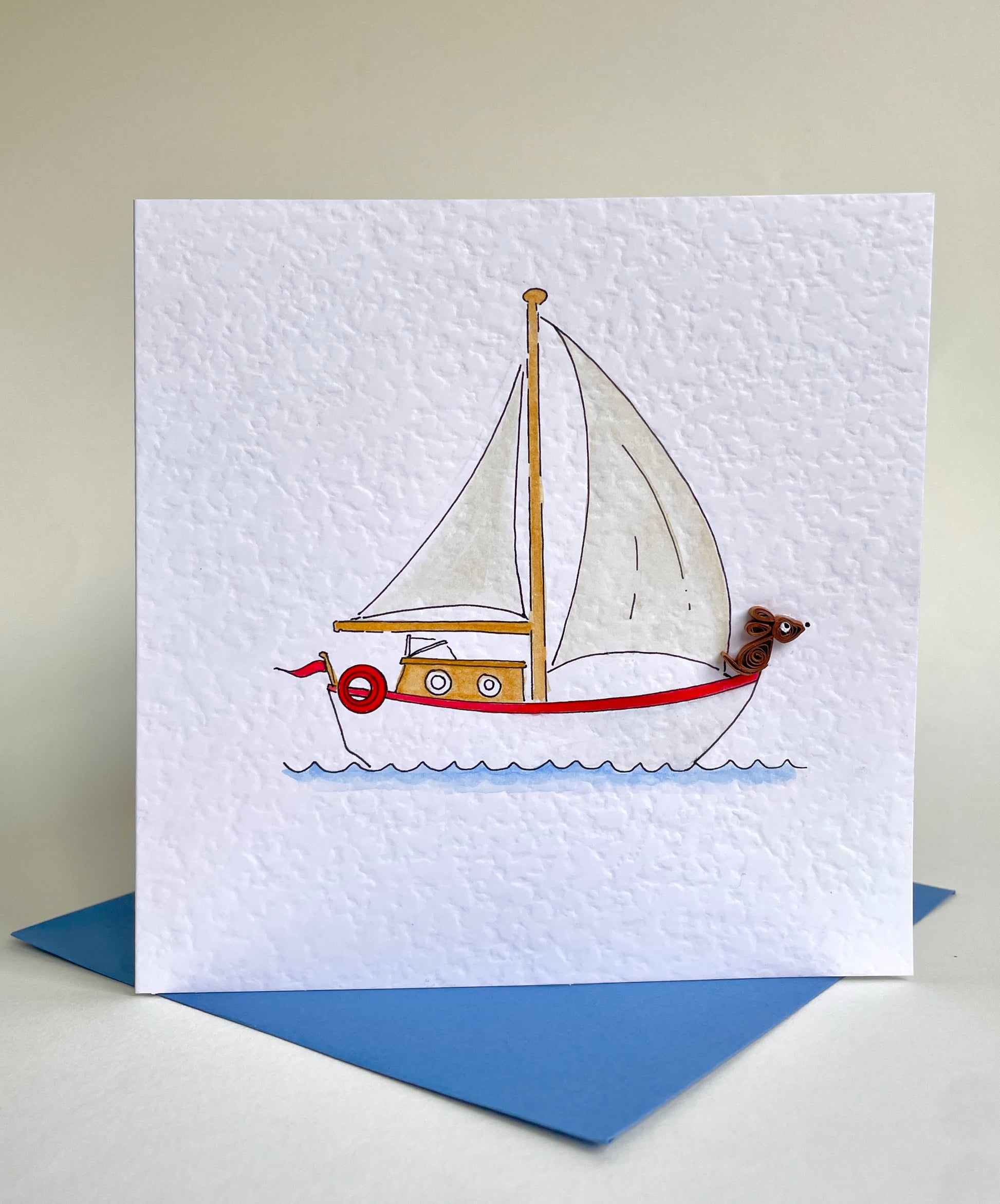 Send a smile across the sea with this hand painted card featuring a quilled pup sailing on a hand-painted watercolour boat. Each card is carefully crafted, combining delicate paper quilling – perfect for dog lovers, coastal fans, or anyone who appreciates handmade art.